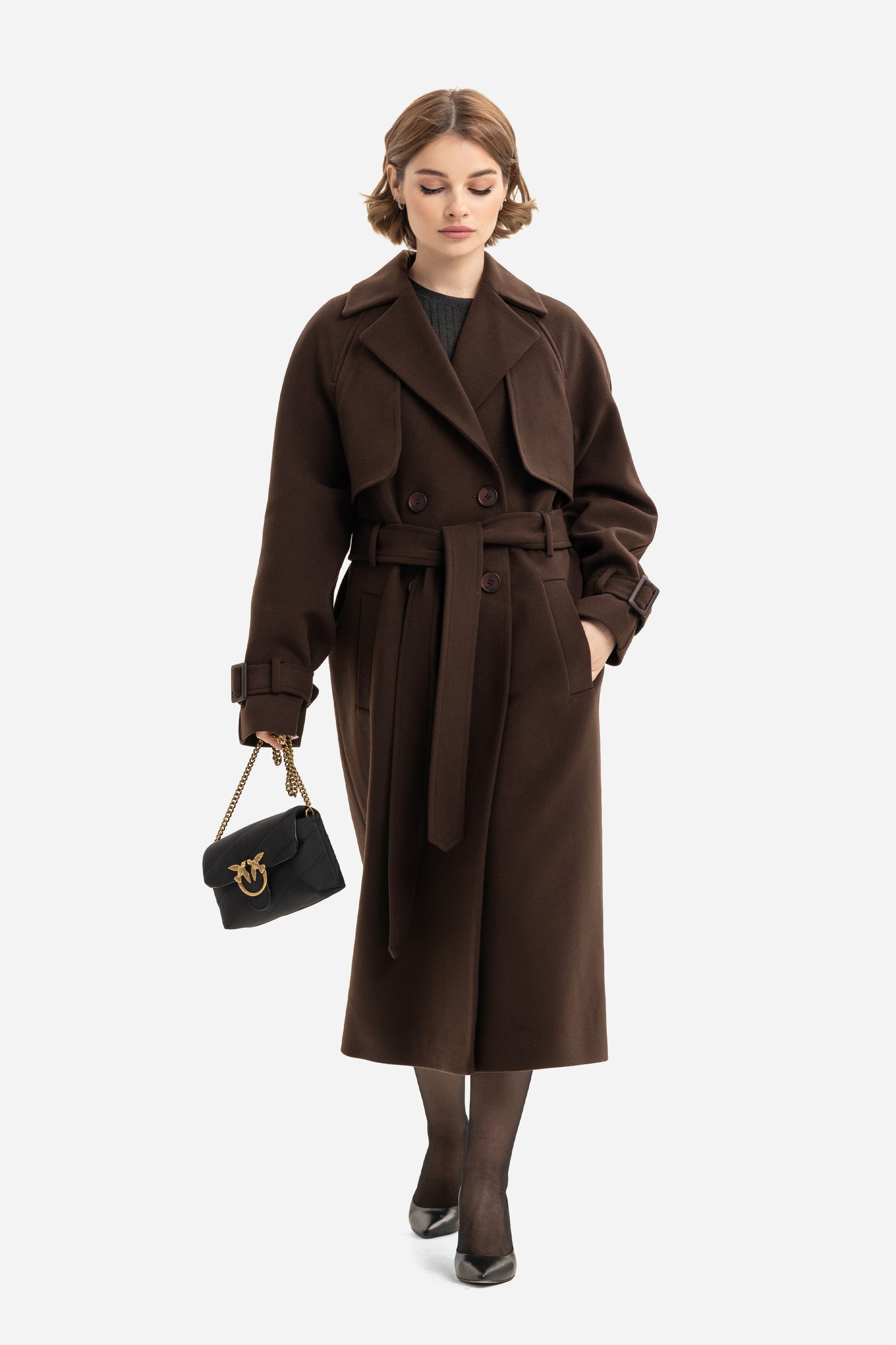 An elegant coat is a must-have for the cold season. A long coat with a straight silhouette, a regular fit. The front and back yokes attract attention. A classic collar. A raglan sleeve with a smooth shoulder line. The bottom of the sleeves is decorated with patas. The product fastens with buttons and snaps. There are side pockets. A belt will accentuate the waist.