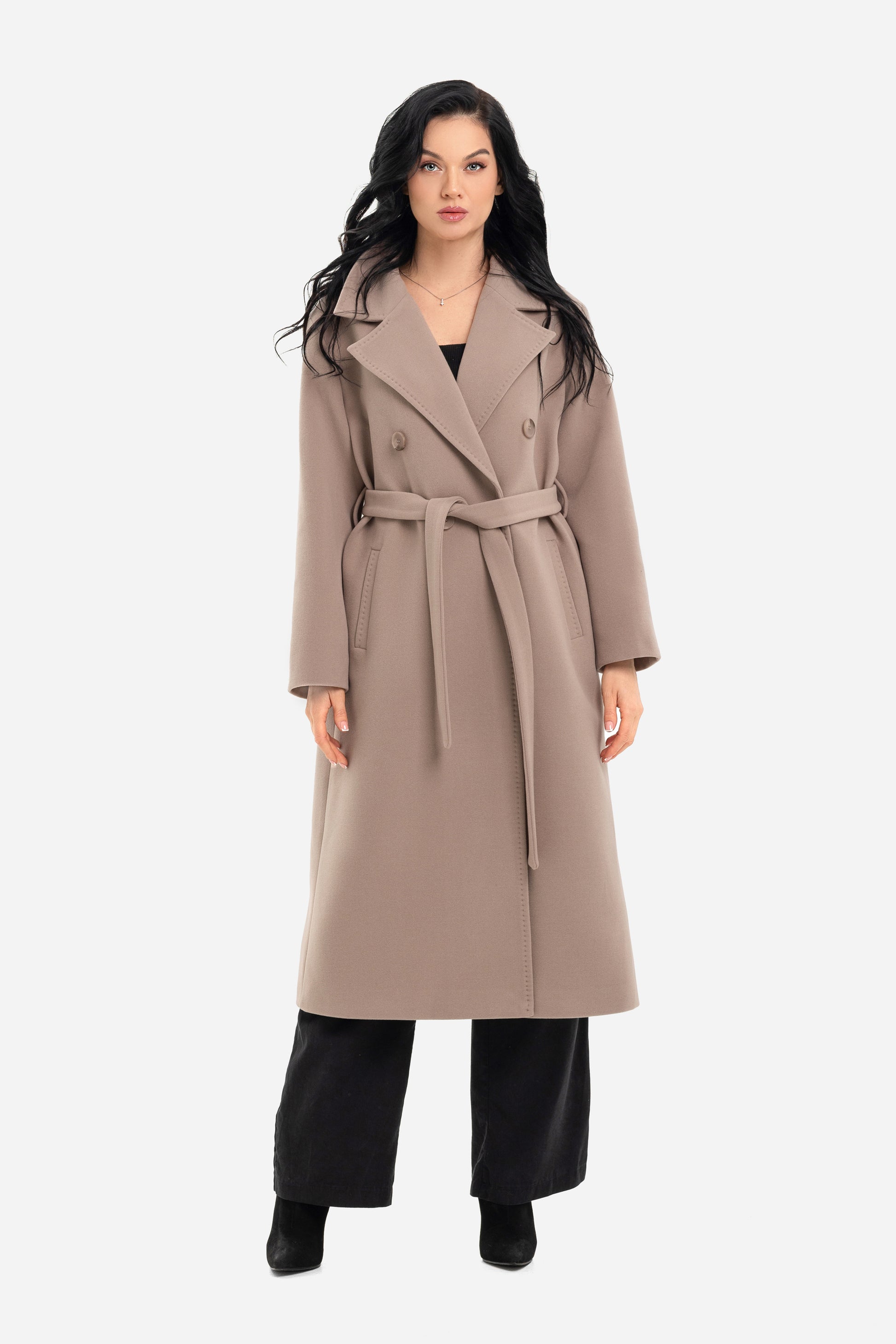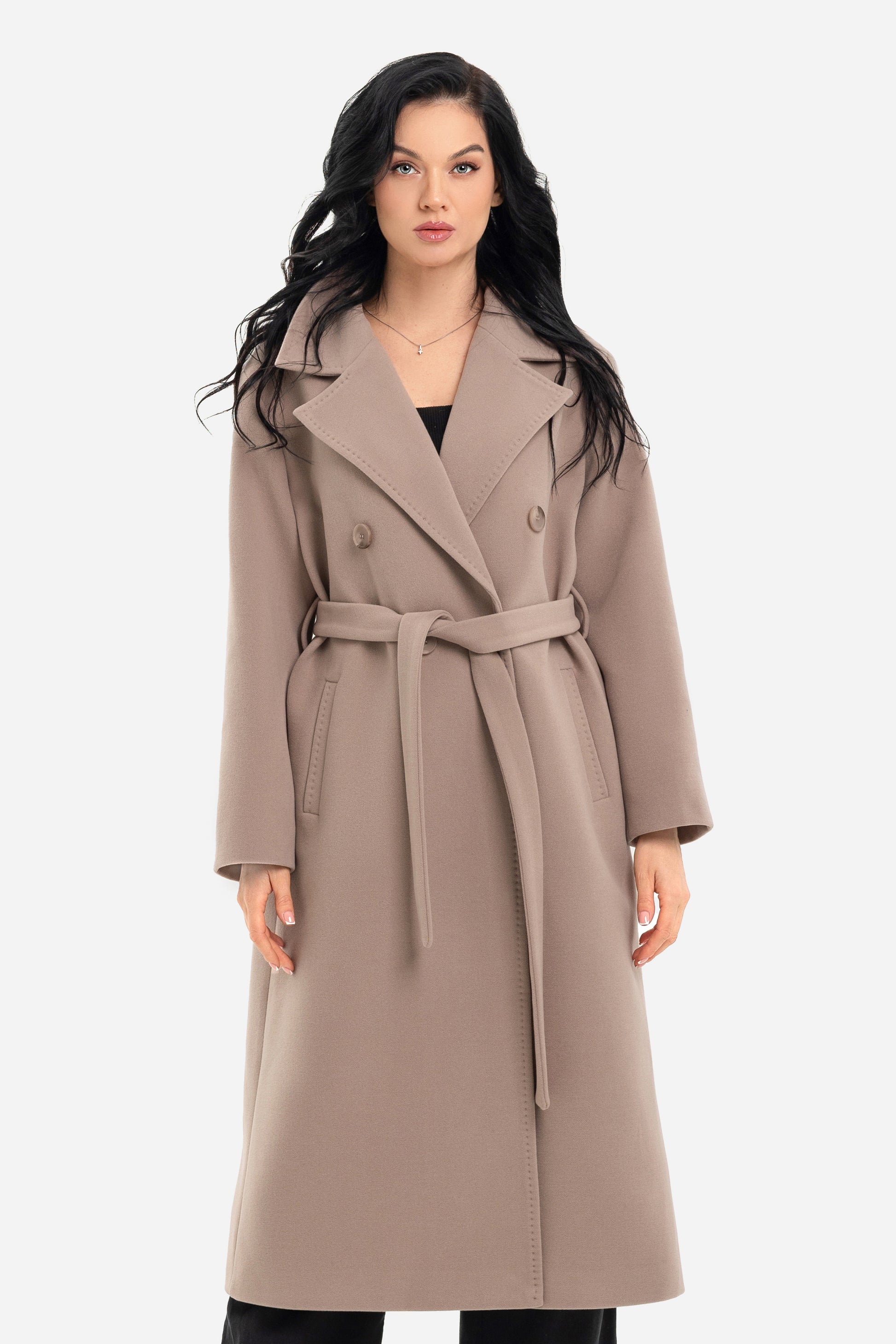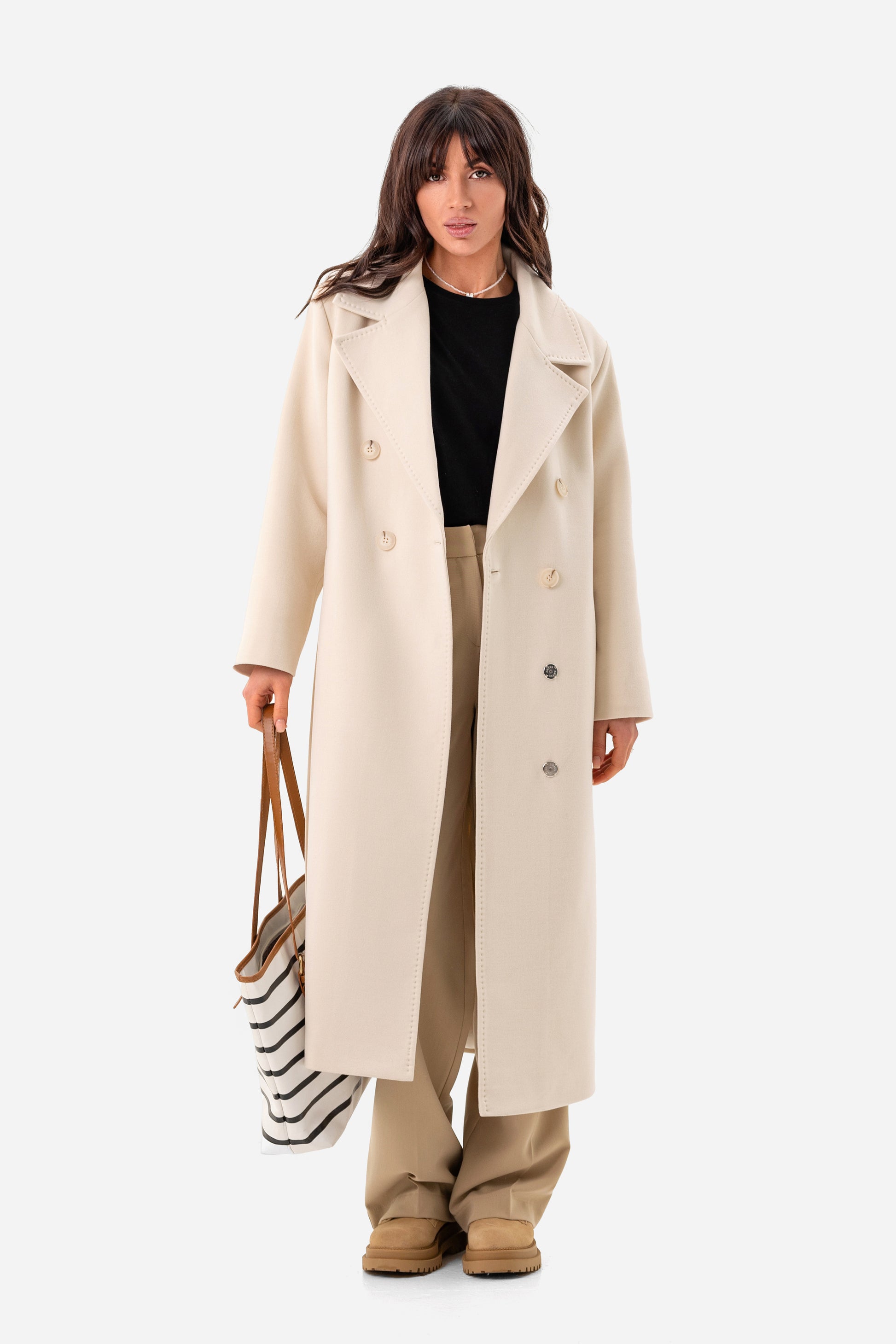 A straight silhouette model with a slight flare to the bottom. Two rows of buttons on the front, hidden snaps under the hem. A decorative stitch makes the model elegant. A comfortable coat looks great with a belt.