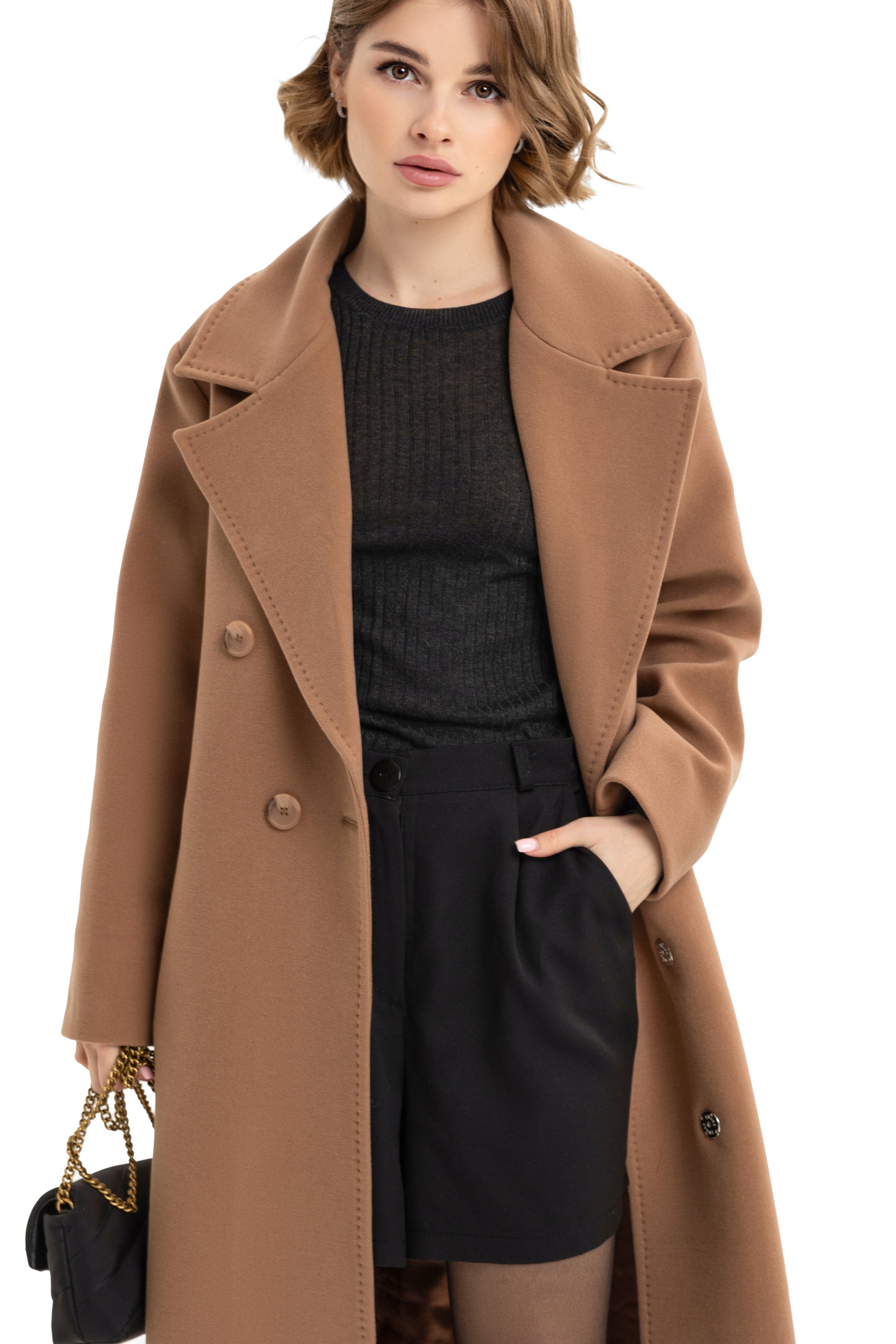 A straight silhouette model with a slight flare to the bottom. Two rows of buttons on the front, hidden snaps under the hem. A decorative stitch makes the model elegant. A comfortable coat looks great with a belt.