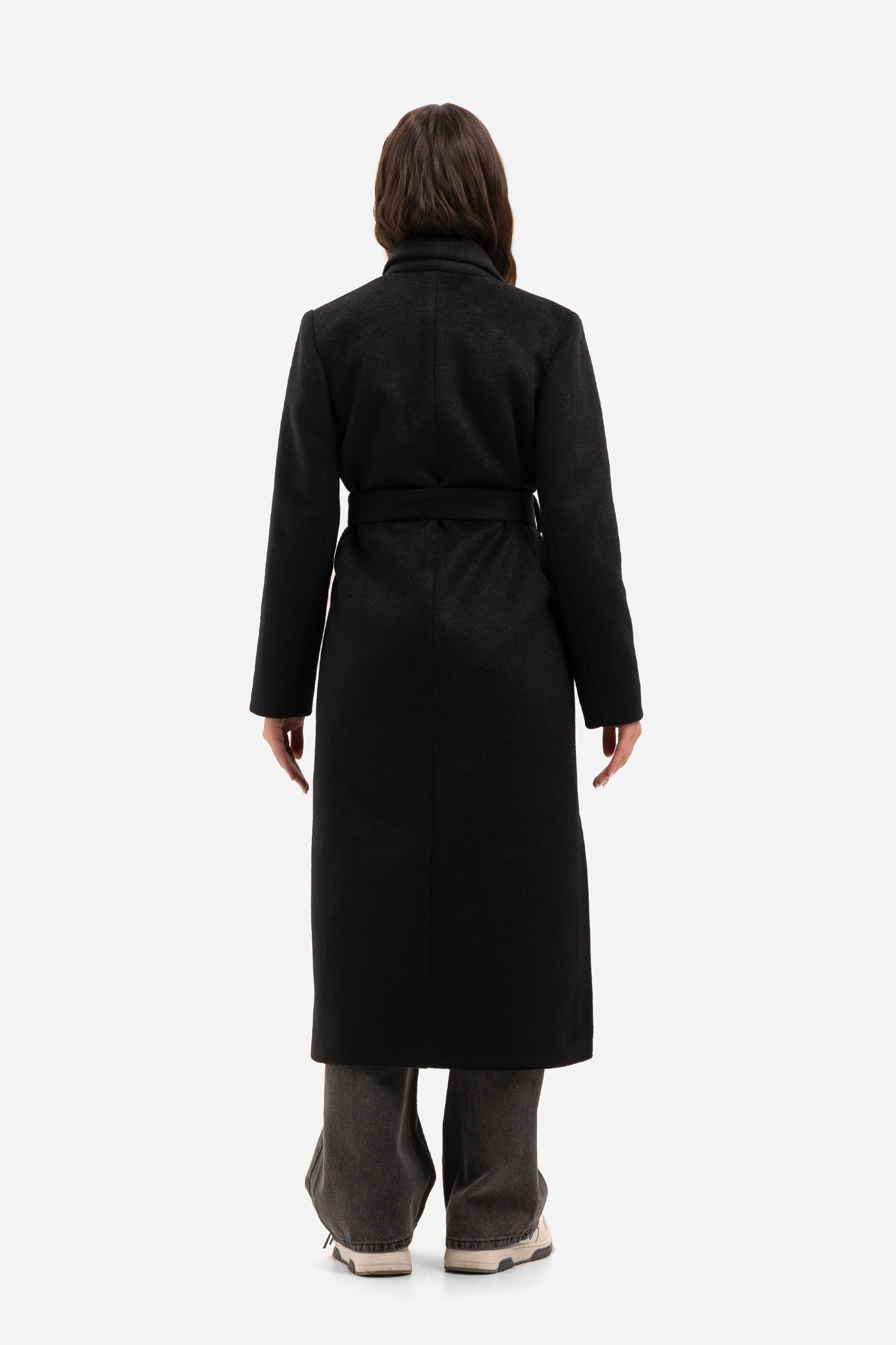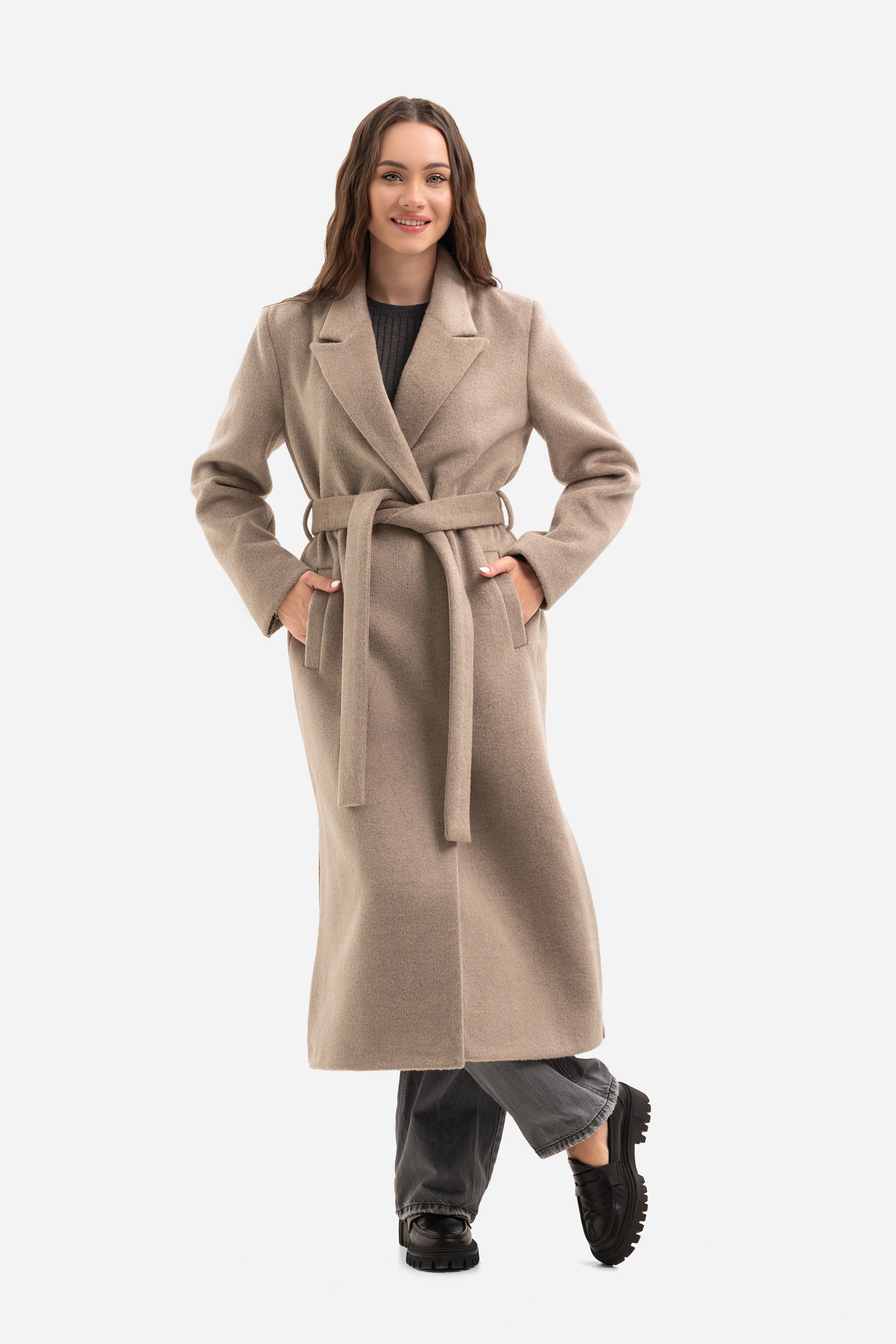 This coat is the embodiment of contemporary sophistication. Crafted from soft, textured wool fabric, it features a classic notched collar, set-in sleeves, and neat welt pockets. Side slits add a touch of movement to the long silhouette, while snap-button fastening and a belt complete the refined look.